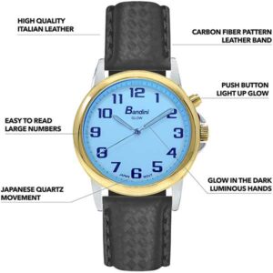 Bandini Mens Glow Watch – Carbon Fiber Leather Band – 38mm Analog Men’s Easy to Read Wrist Watch with Light, Light Up Watches, Quartz, White Dial, Big Numbers, Glow in Dark Hands – Two-Tone / Black