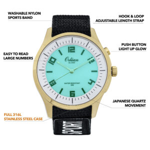 - QUALITY, DURABLE & WATER RESISTANT: All Orlean wrist watches have a full 316L stainless steel case and a high quality washable hook and loop nylon band and come with a very precise Citizen Miyota Japanese quartz movement with seconds hand and a durable mineral crystal glass. Also watch casing is 30M (100ft) water resistant, making them the perfect everyday watch