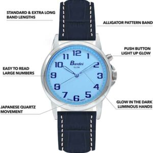 Bandini Mens Glow Watch – Alligator Pattern Leather Band – 38mm Analog Men’s Easy to Read Watch with Light, Light Up Watches, Quartz, White Dial, Big Numbers, Glow in Dark Hands – Silver Tone / Blue