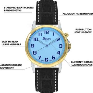 Bandini Mens Glow Watch – Alligator Pattern Leather Band – 38mm Analog Men’s Easy to Read Watch with Light, Light Up Watches, Quartz, White Dial, Big Numbers, Glow in Dark Hands – Two-Tone / Black