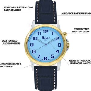Bandini Mens Glow Watch – Alligator Pattern Leather Band – 38mm Analog Men’s Easy to Read Watch with Light, Light Up Watches, Quartz, White Dial, Big Numbers, Glow in Dark Hands – Two-Tone / Blue