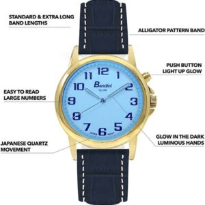 Bandini Mens Glow Watch – Extra Long Alligator Pattern Leather Band – 38mm Analog Men’s Easy Read Watch with Light Up, Quartz, White Dial, Big Numbers, Glow in Dark Hands – Gold Tone / Blue