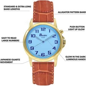 Bandini Mens Glow Watch – Extra Long Alligator Pattern Leather Band – 38mm Analog Men’s Easy Read Watch with Light Up, Quartz, White Dial, Big Numbers, Glow in Dark Hands – Gold Tone / Tan
