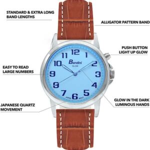 Bandini Mens Glow Watch – Extra Long Alligator Pattern Leather Band – 38mm Analog Men’s Easy Read Watch with Light Up, Quartz, White Dial, Big Numbers, Glow in Dark Hands – Silver Tone / Tan