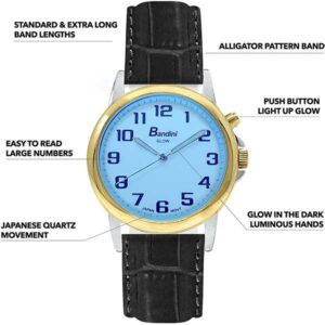Bandini Mens Glow Watch – Extra Long Alligator Pattern Leather Band – 38mm Analog Men’s Easy Read Watch with Light Up, Quartz, White Dial, Big Numbers, Glow in Dark Hands – Two-Tone / Black