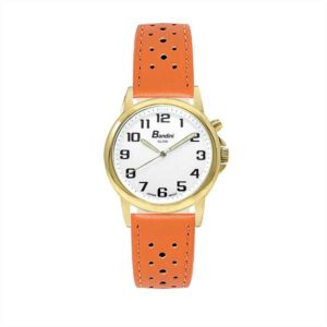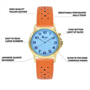 Bandini Mens Glow Watch – Extra Long Leather Rally Strap – 38mm Analog Men’s Easy to Read Watch with Light, Light Up Watches, Quartz, White Dial, Big Numbers, Glow in Dark Hands – Gold Tone / Orange