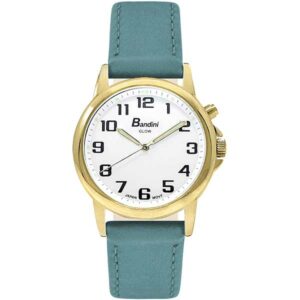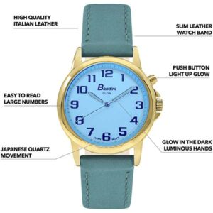 Bandini Mens Glow Watch – Leather Band – 38mm Analog Men’s Easy to Read Wrist Watch with Light, Light Up Watches, Quartz, White Dial, Big Numbers, Glow in the Dark Hands – Gold Tone / Blue