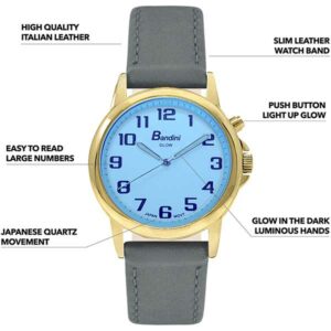 Bandini Mens Glow Watch – Leather Band – 38mm Analog Men’s Easy to Read Wrist Watch with Light, Light Up Watches, Quartz, White Dial, Big Numbers, Glow in the Dark Hands – Gold Tone / Grey