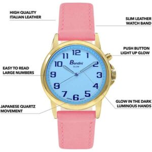 Bandini Mens Glow Watch – Leather Band – 38mm Analog Men’s Easy to Read Wrist Watch with Light, Light Up Watches, Quartz, White Dial, Big Numbers, Glow in the Dark Hands – Gold Tone / Pink