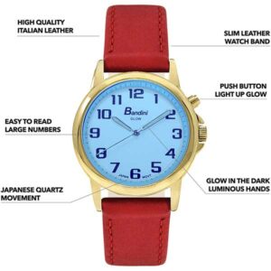 Bandini Mens Glow Watch – Leather Band – 38mm Analog Men’s Easy to Read Wrist Watch with Light, Light Up Watches, Quartz, White Dial, Big Numbers, Glow in the Dark Hands – Gold Tone / Red