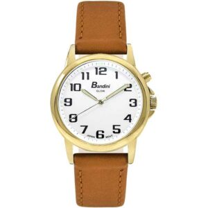 Bandini Mens Glow Watch – Leather Band – 38mm Analog Men’s Easy to Read Wrist Watch with Light, Light Up Watches, Quartz, White Dial, Big Numbers, Glow in the Dark Hands – Gold Tone / Tan