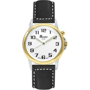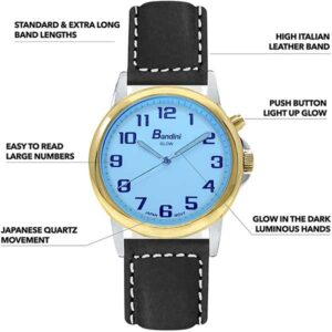Bandini Mens Glow Watch – Leather Band – 38mm Analog Men’s Easy to Read Wrist Watch with Light, Light Up Watches, Quartz, White Dial, Big Numbers, Glow in the Dark Hands – Two-Tone / Black