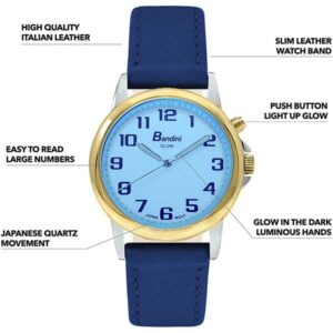 Bandini Mens Glow Watch – Leather Band – 38mm Analog Men’s Easy to Read Wrist Watch with Light, Light Up Watches, Quartz, White Dial, Big Numbers, Glow in the Dark Hands – Two-Tone / Blue
