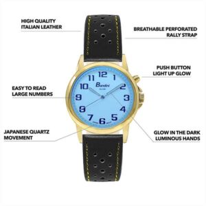 Bandini Mens Glow Watch – Leather Rally Strap – 38mm Analog Men’s Easy to Read Watch with Light, Light Up Watches, Quartz, White Dial, Big Numbers, Glow in Dark Hands – Gold Tone / Black and Yellow