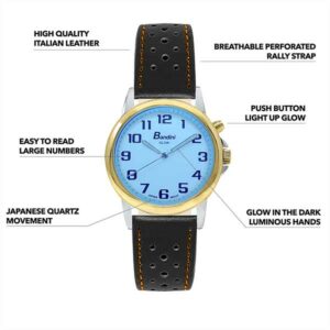 Bandini Mens Glow Watch – Leather Rally Strap – 38mm Analog Men’s Easy to Read Watch with Light, Light Up Watches, Quartz, White Dial, Big Numbers, Glow in Dark Hands – Two-Tone / Black and Orange