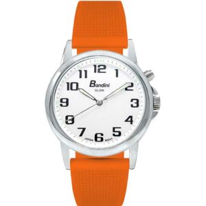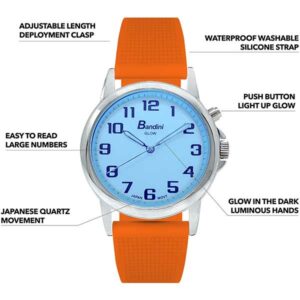Bandini Mens Glow Watch – Washable Deployment Silicone Band – 38mm Analog Men’s Easy Read Watch with Light, Light Up Watches, Quartz, White Dial, Big Numbers, Glow in Dark Hands – Silver Tone / Orange