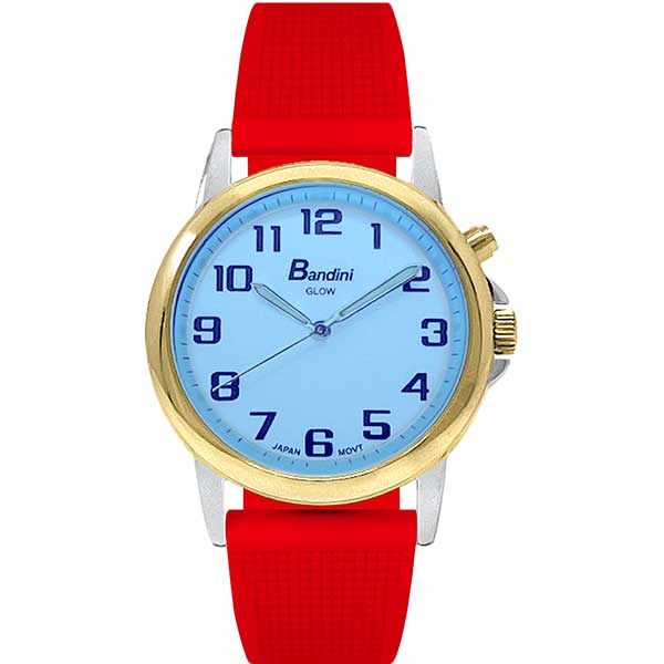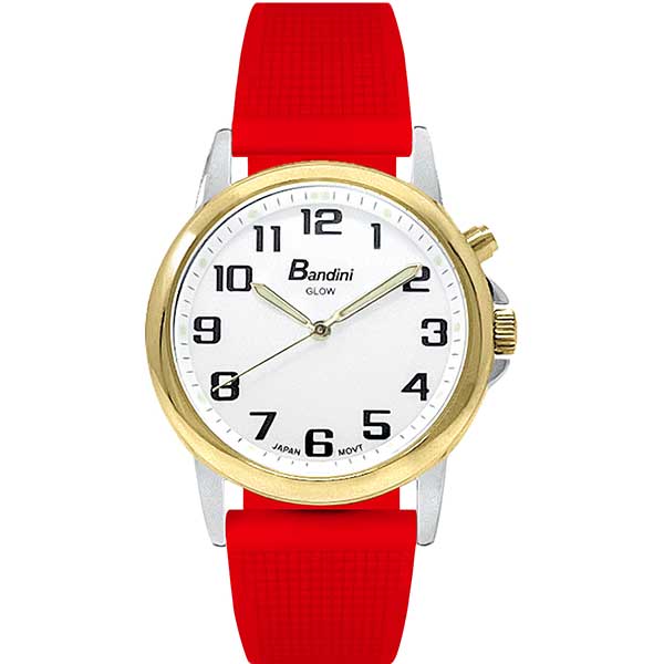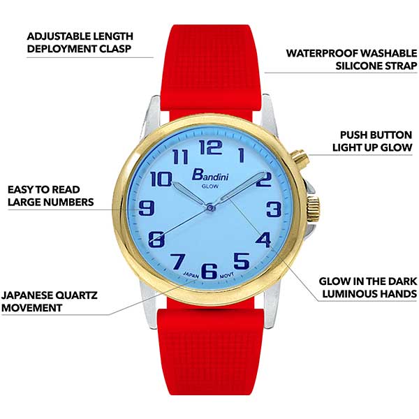 Bandini Mens Glow Watch – Washable Deployment Silicone Band – 38mm Analog Men’s Easy Read Wrist Watch with Light, Light Up Watches, Quartz, White Dial, Big Numbers, Glow in Dark Hands – Two-Tone / Red