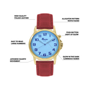 Bandini Womens Glow Watch – Alligator Pattern Leather Band – 28mm Analog Women’s Easy to Read Watch with Light, Light Up Watches, Quartz, White Dial, Big Numbers, Glow in Dark Hands – Gold Tone / Red