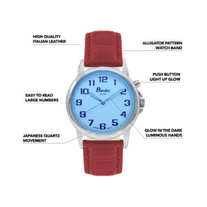 Bandini Womens Glow Watch – Alligator Pattern Leather Band, 28mm Analog Women’s Easy to Read Watch with Light, Light Up Watches, Quartz, White Dial, Big Numbers, Glow in Dark Hands – Silver Tone / Red