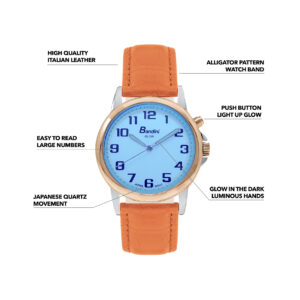 Bandini Womens Glow Watch – Alligator Pattern Leather Band – 28mm Analog Women’s Easy to Read Watches Light Up, Quartz, White Dial, Big Numbers, Glow in the Dark Hands – Rose Gold Tone / Orange
