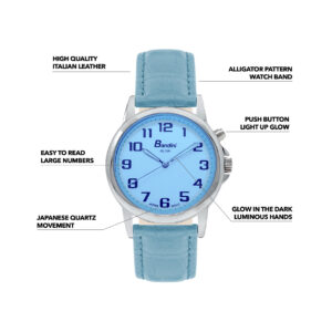 Bandini Womens Glow Watch – Alligator Pattern Leather Band – 28mm Analog Women’s Easy to Read Watches Light Up, Quartz, White Dial, Big Numbers, Glow in the Dark Hands – Silver Tone / Blue