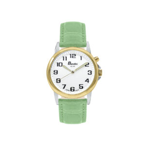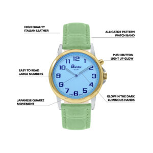 Bandini Womens Glow Watch – Alligator Pattern Leather Band – 28mm Analog Women’s Easy to Read Watches Light Up, Quartz, White Dial, Big Numbers, Glow in the Dark Hands – Two-Tone / Light Green