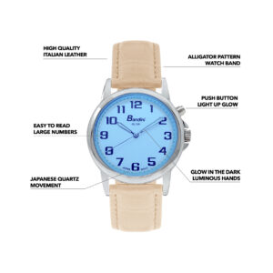 Bandini Womens Glow Watch – Alligator Pattern Leather Band, 28mm Analog Women’s Easy to Read Watches with Light Up, Quartz, White Dial, Big Numbers, Glow in Dark Hands – Silver Tone / Beige