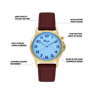 Bandini Womens Glow Watch – Leather Band – 28mm Analog Women’s Easy to Read Wrist Watch with Light, Light Up Watches, Quartz, White Dial, Big Numbers, Glow in the Dark Hands – Gold Tone / Burgundy