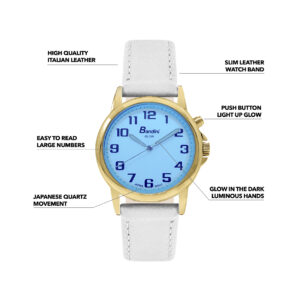 Bandini Womens Glow Watch – Leather Band – 28mm Analog Women’s Easy to Read Wrist Watch with Light, Light Up Watches, Quartz, White Dial, Big Numbers, Glow in the Dark Hands – Gold Tone / White