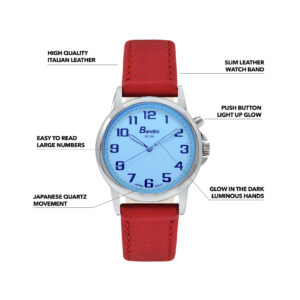Bandini Womens Glow Watch – Leather Band – 28mm Analog Women’s Easy to Read Wrist Watch with Light, Light Up Watches, Quartz, White Dial, Big Numbers, Glow in the Dark Hands – Silver Tone / Red