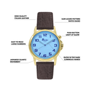 Bandini Womens Glow Watch – Lizard Pattern Leather Band – 28mm Analog Women’s Easy to Read Watch with Light, Light Up Watches, Quartz, White Dial, Big Numbers, Glow in Dark Hands – Gold Tone / Brown