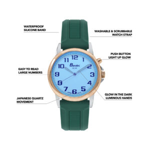 Bandini Womens Glow Watch – Washable Silicone Band – 28mm Analog Women’s Easy Read Watch with Light, Light Up Watches, Quartz, White Dial, Big Numbers, Glow in Dark Hands – Rose Gold Tone / Green