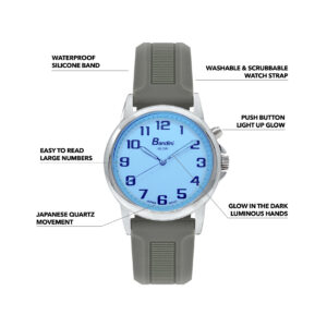Bandini Womens Glow Watch – Washable Silicone Band – 28mm Analog Women’s Easy Read Wrist Watch with Light, Light Up Watches, Quartz, White Dial, Big Numbers, Glow in Dark Hands – Silver Tone / Grey