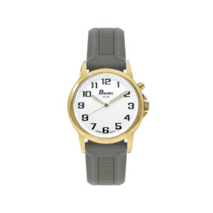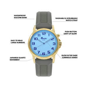 Bandini Womens Glow Watch – Washable Silicone Band – 28mm Analog Women’s Easy Read Wrist Watch with Light, Light Up Watches, Quartz, White Dial, Big Numbers, Glow in the Dark Hands – Gold Tone / Grey