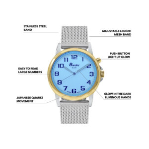 Bandini Womens Mesh Glow Watch – Stainless Steel Adjustable Band, 28mm Analog Women’s Metal Watches – Japanese Quartz – White Dial, Large Easy to Read Numbers, Glow in Dark Hands – Two-Tone / Two-Tone