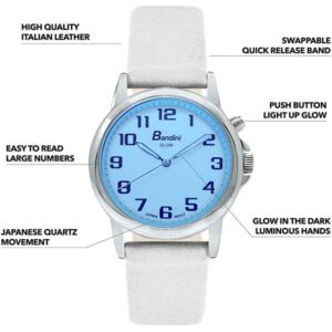 Bandni Mens Glow Watch – Leather Quick Release Band – 38mm Analog Men’s Easy to Read Wrist Watch with Light, Light Up Watches, Quartz, White Dial, Big Numbers, Glow in Dark Hands – Silver Tone / White