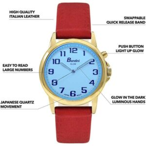 Bandni Mens Glow Watch – Leather Quick Release Band – 38mm Analog Men’s Easy to Read Wrist Watch with Light, Light Up Watches, Quartz, White Dial, Big Numbers, Glow in the Dark Hands – Gold Tone / Red