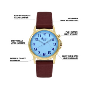 Bandni Womens Glow Watch – Leather Quick Release Band – 28mm Analog Women’s Easy to Read Watch with Light, Light Up Watches, Quartz, White Dial, Big Numbers, Glow in Dark Hands – Gold Tone / Burgundy