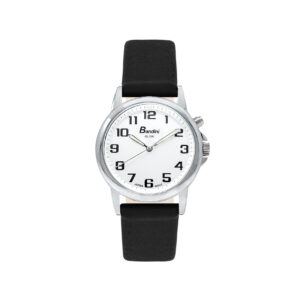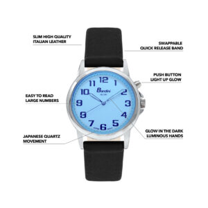 Bandni Womens Glow Watch – Leather Quick Release Band – 28mm Analog Women’s Easy to Read Watch with Light, Light Up Watches, Quartz, White Dial, Big Numbers, Glow in Dark Hands – Silver Tone / Black