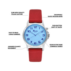 Bandni Womens Glow Watch – Leather Quick Release Band – 28mm Analog Women’s Easy to Read Watch with Light, Light Up Watches, Quartz, White Dial, Big Numbers, Glow in Dark Hands – Silver Tone / Red